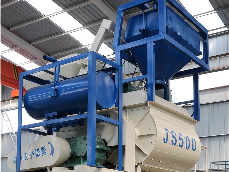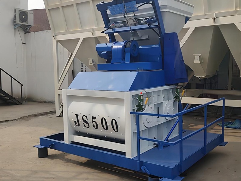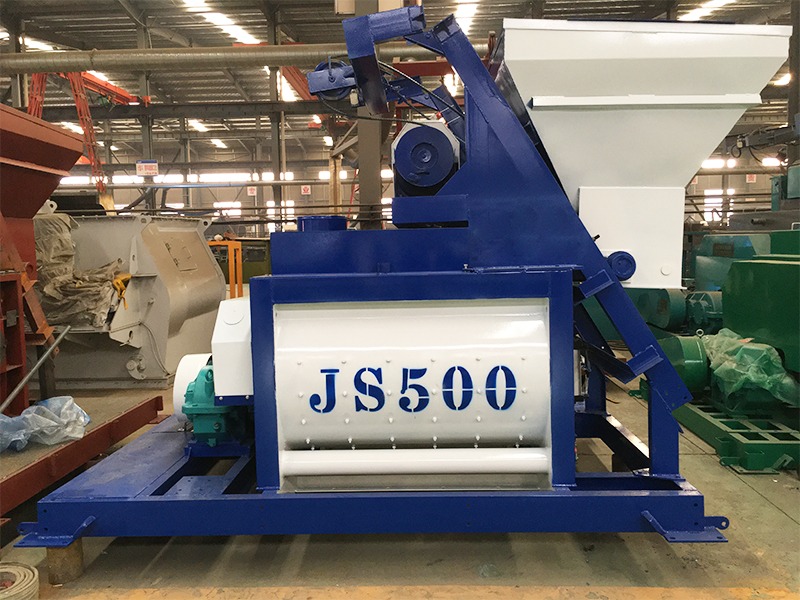 JS500 concrete mixer is a double-horizontal-shaft forced mixer. Each drum can mix 500L of concrete (referring to the volume of compacted concrete), and can produce 30 cubic meters per hour.